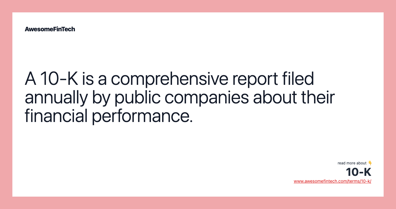 A 10-K is a comprehensive report filed annually by a publicly-traded company about its financial performance and is required by the U.S. Securities and Exchange Commission (SEC). The report contains much more detail than a company's annual report, which is sent to its shareholders before an annual meeting to elect company directors.