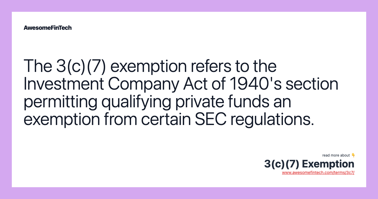 The 3(c)(7) exemption refers to a portion of the Investment Company Act of 1940 that allows private investment companies an exemption from some Securities and Exchange Commission (SEC) regulation, providing that they meet certain criteria. 3C7 is shorthand for the 3(c)(7) exemption.