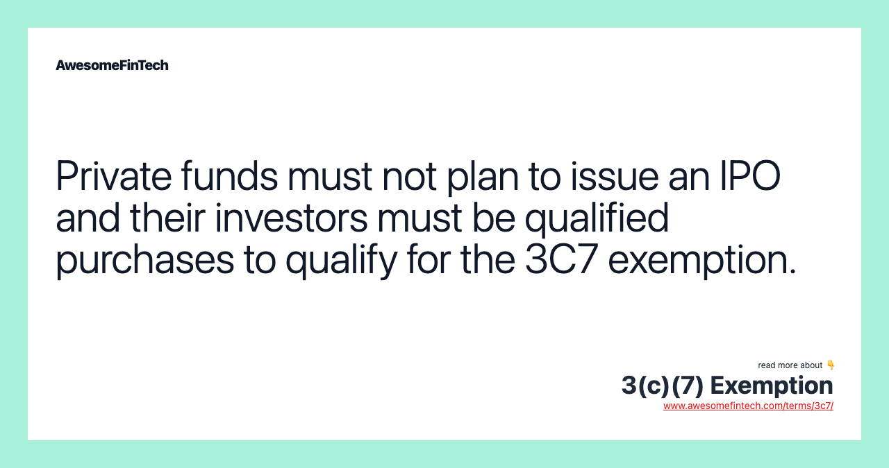 The 3(c)(7) exemption refers to a portion of the Investment Company Act of 1940 that allows private investment companies an exemption from some Securities and Exchange Commission (SEC) regulation, providing that they meet certain criteria. 3C7 is one of two exemptions in the Investment Company Act of 1940 that hedge funds, venture capital funds, and other private equity funds use to avoid SEC restrictions. This frees up these funds to use tools like leverage and derivatives to an extent that most publicly traded funds cannot. That said, 3C7 funds must maintain their compliance to continue utilizing this exemption from the 1940 Act. If a fund were to fall out of compliance by taking in investments from non-qualified purchasers, for example, it would open itself to SEC enforcement actions as well as litigation from its investors and any other parties it has contracts with. Both 3C7 and 3C1 funds are exempted from the requirements imposed on “investment companies” under the Investment Company Act of 1940 (the “Act”). The exemption, found in section three of the act, reads in part: > Section 3 > (3)(c) Notwithstanding subsection (a), none of the following persons is an investment company within the meaning of this title: > (7)(A) Any issuer, the outstanding securities of which are owned exclusively by persons who, at the time of acquisition of such securities, are qualified purchasers, and which is not making and does not at that time propose to make a public offering of such securities. To qualify for the 3C7 exemption, the private investment company must show that they have no plans of making an initial public offering (IPO) and that their investors are qualified purchasers. The vast majority of new hedge funds, private equity funds, venture capital funds, and other private investment vehicles are organized so as to fall outside the purview of the Investment Company Act of 1940.