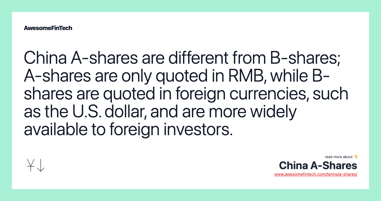 China A-shares are different from B-shares. A-shares are only quoted in RMB, while B-shares are quoted in foreign currencies, such as the U.S. dollar, and are more widely available to foreign investors. Foreign investors may have difficulty accessing A-shares because of Chinese government regulations, and Chinese investors may have difficulty accessing B shares most notably for currency-exchange reasons. Some companies opt to have their stock listed on both the A-shares and B-shares market.