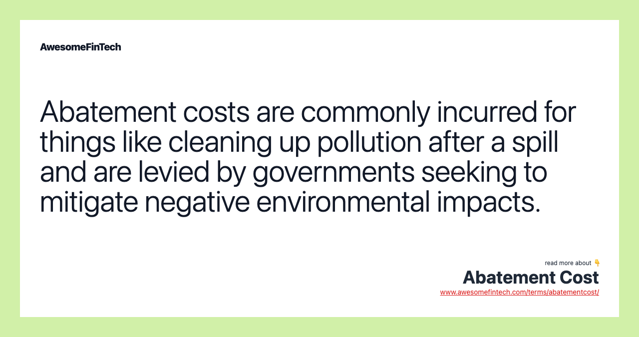 As businesses shift towards pursuing environmental, social, and governance (ESG) means, abatement costs play a large role in discouraging companies from leniency on their environmental, greenhouse gas emissions. Specifically, abatement costs are there as "fines" for companies that either fail to innovate in creating greener production cycles or fail to account for potential problems and end up damaging the environment. The most common scenario in which abatement costs are applied is for pollution and oil spills, whether accidental or intentional.