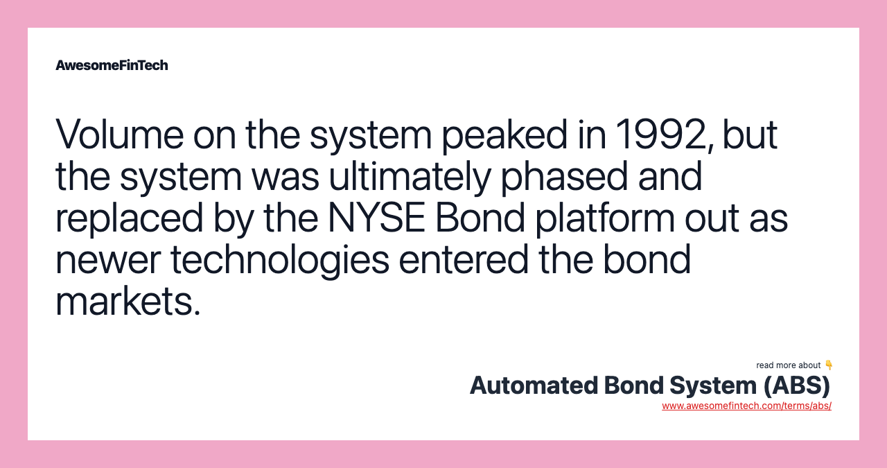 The Automated Bond System (ABS) was an early electronic bond-trading platform the New York Stock Exchange (NYSE) used from 1977 to 2007. The system was used to record bids and offers for inactively traded bonds until they were canceled or executed on the exchange.