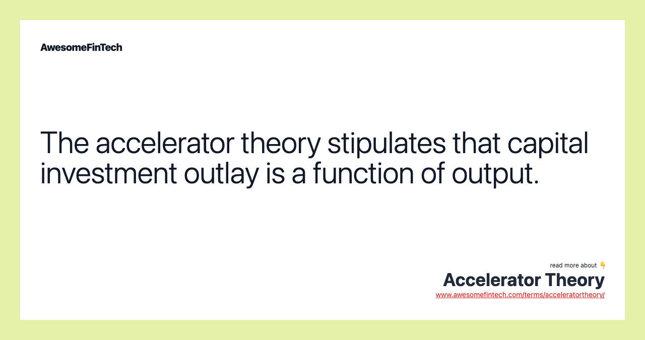 The accelerator theory is an economic postulation whereby investment expenditure increases when either demand or income increases. The theory also suggests that when there is excess demand, companies can either decrease demand by raising prices or increase investment to meet the level of demand. The accelerator theory posits that companies typically choose to increase production, thereby increasing profits, to meet their fixed capital to output ratio.