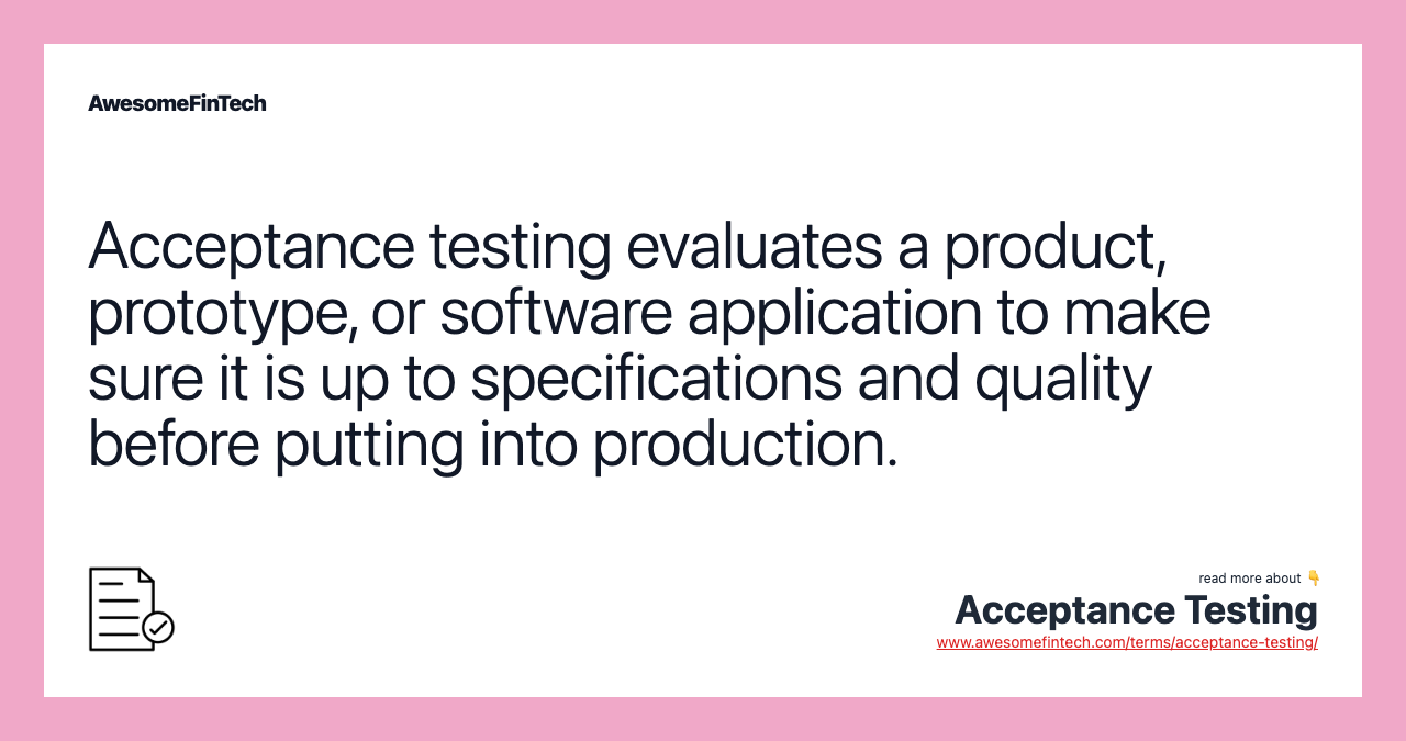 Acceptance testing, in the context of the engineering and software industries, is a functional trial performed on a product or prototype before it is put on the market or delivered, to decide whether the specifications or contract have been met. It also makes sure the quality and design of the product meet both contractual and regulatory obligations in terms of functionality, usability, durability, and safety.