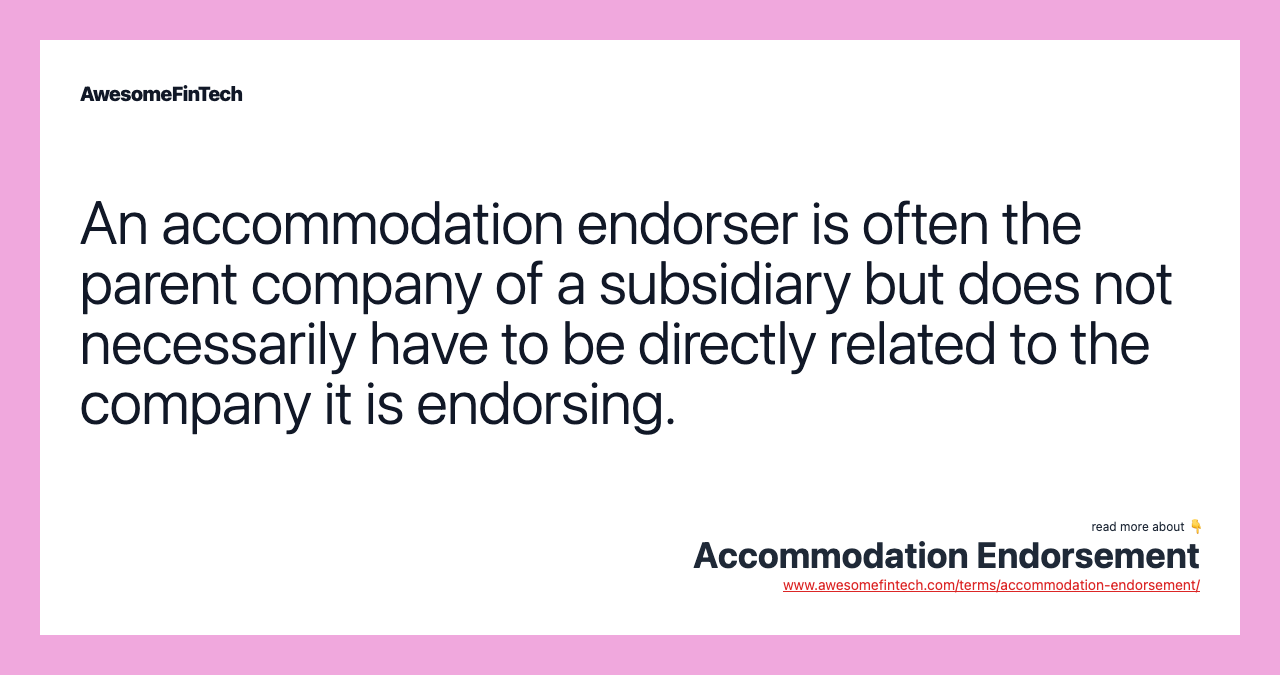An accommodation endorsement is an agreement for one business to back the credit liability of another. An accommodation endorser is often the parent company of a subsidiary but does not necessarily have to be directly related to the company it is endorsing. The accommodation endorser should always be aware of the backing that they are providing to ensure that they will be able to cover any liabilities in case the company they are backing fails to meet its financial obligations. Similarly, an accommodation endorsement happens when a subsidiary company applies for a loan, but it's not entirely foolproof that this entity can pay, due to its below-par balance sheet. For example, a parent company often provides accommodation endorsements to a subsidiary.