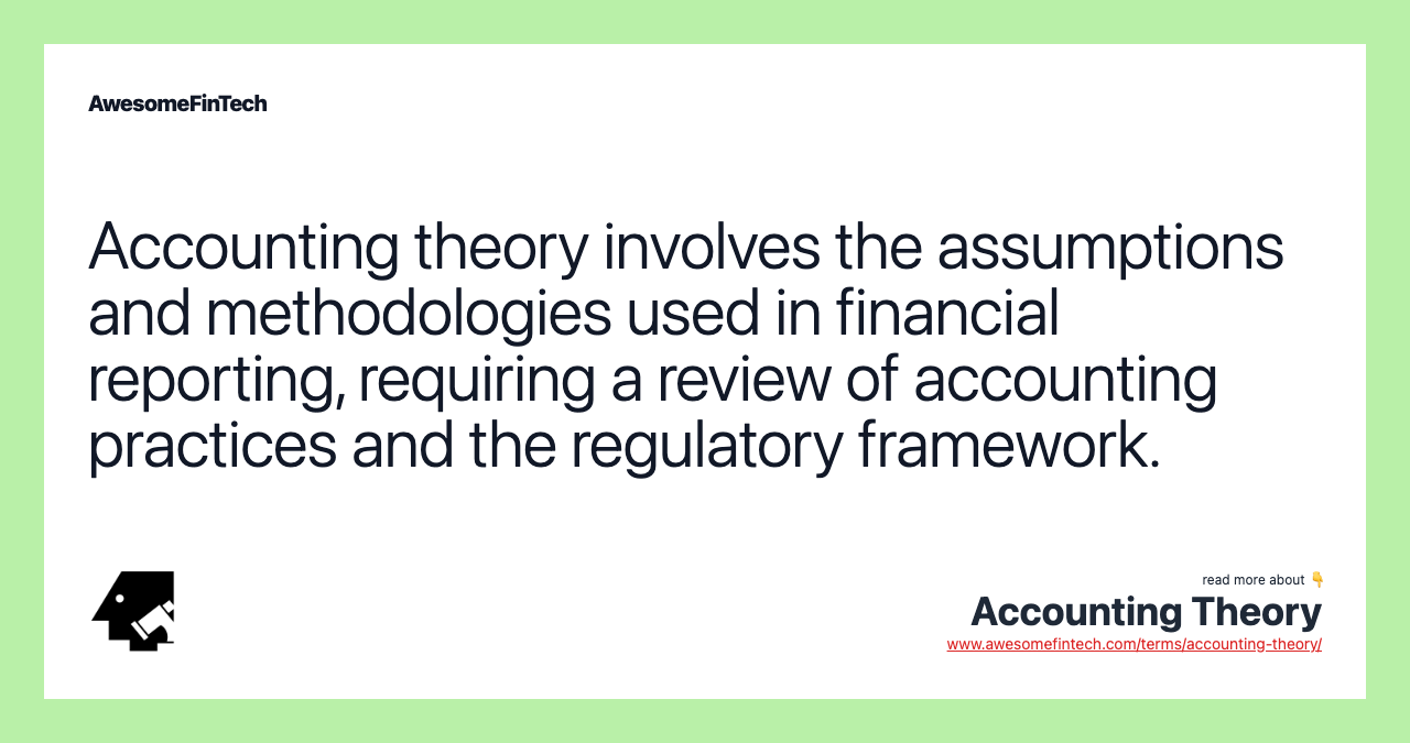 Accounting theory is a set of assumptions, frameworks, and methodologies used in the study and application of financial reporting principles. The study of accounting theory involves a review of both the historical foundations of accounting practices, as well as the way in which accounting practices are changed and added to the regulatory framework that governs financial statements and financial reporting.