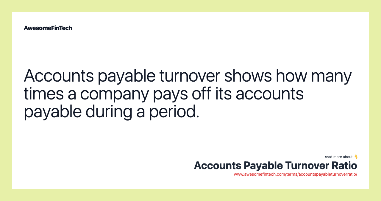 The accounts payable turnover ratio is used to quantify the rate at which a company pays off its suppliers. Accounts payable turnover shows how many times a company pays off its accounts payable during a period.