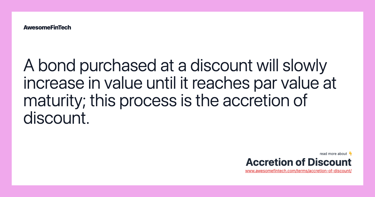 Accretion of discount is the increase in the value of a discounted instrument as time passes and the maturity date looms closer. The value of the instrument will accrete (grow) at the interest rate implied by the discounted issuance price, the value at maturity, and the term to maturity.