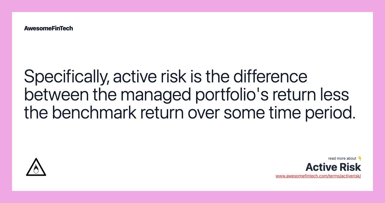 Active risk is the risk a manager takes on in their efforts to outperform a benchmark and achieve higher returns for investors. Actively managed funds will have risk characteristics that vary from their benchmark. Generally, passively-managed funds seek to have limited or no active risk in comparison to the benchmark they seek to replicate.