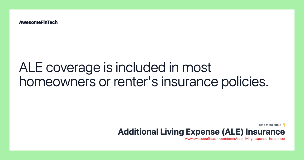Additional living expense (ALE) insurance refers to coverage under a homeowners, condominium owner's, or renter's insurance policy that covers the additional costs of living incurred by a policyholder should they be temporarily displaced from their place of residence. Such coverage usually amounts to about 10% to 20% of the insurance that covers the dwelling.