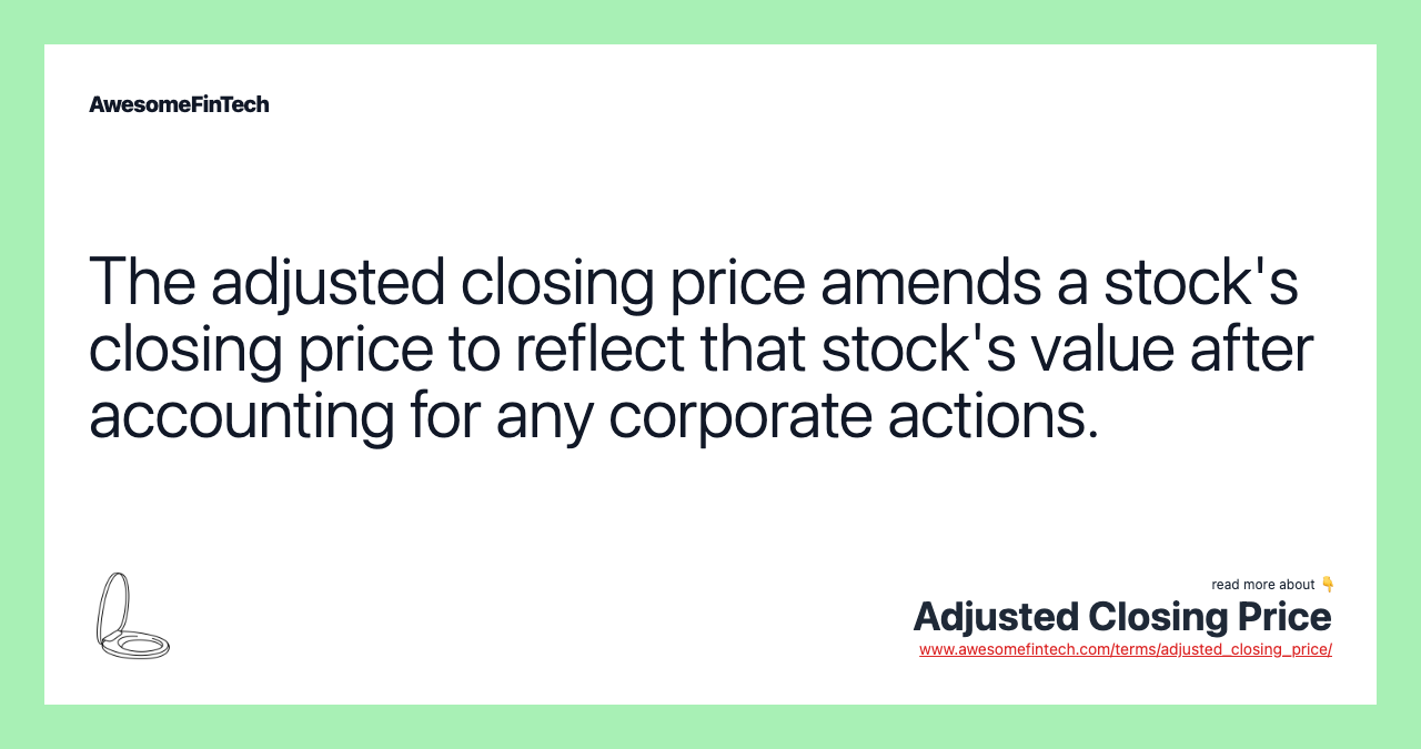 The adjusted closing price amends a stock's closing price to reflect that stock's value after accounting for any corporate actions. It is often used when examining historical returns or doing a detailed analysis of past performance.