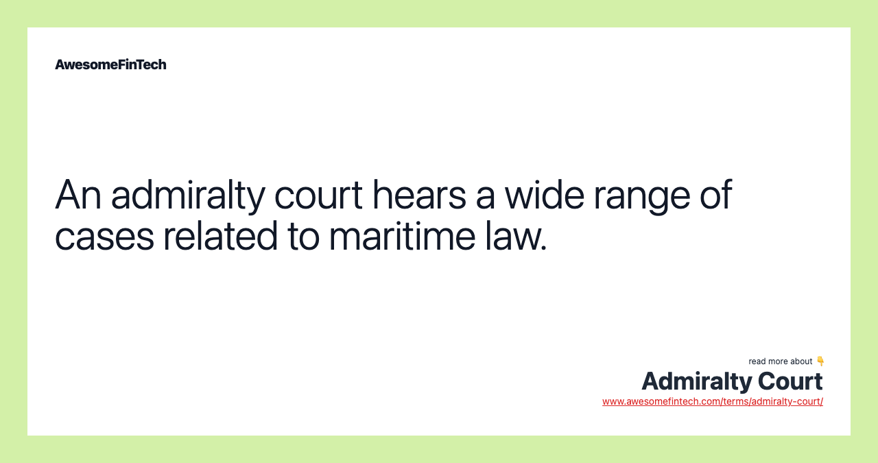 An admiralty court hears shipping, ocean, and sea legal cases. The definition of such cases is broad, encompassing contracts, torts, injuries, and offenses relating to maritime law and events that occur on the high seas.