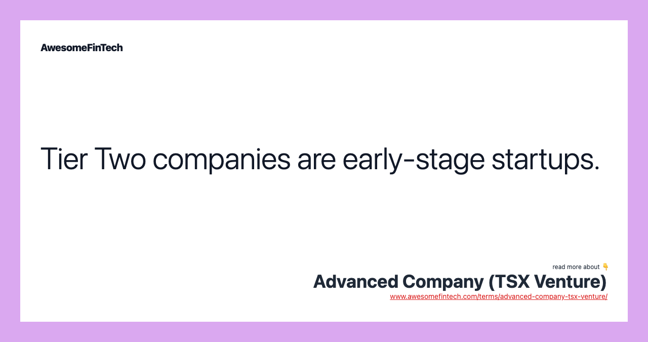 The TSX Venture Exchange primarily lists emerging young companies seeking venture capital. Advanced or Tier One companies have significant financial assets and directors with proven reputations. Tier Two companies are primarily early-stage or junior companies.