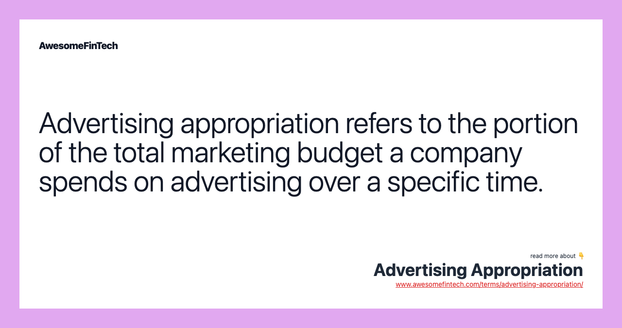 Advertising appropriation — also referred to as an advertising budget — is the portion of a total marketing budget that a company allocates for advertising over a specific time. The advertising appropriation policy for a company may be based on any number of approaches.
