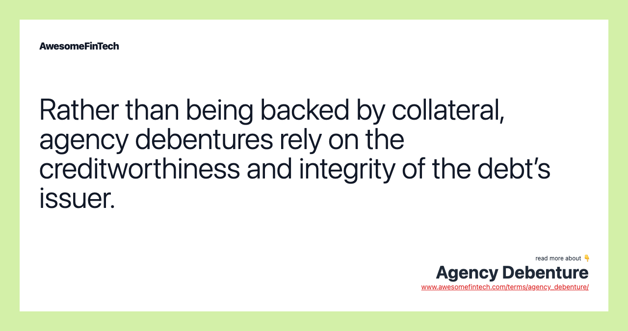 An agency debenture is debt (bonds) issued at a fixed, or variable, interest rate by a United States federal agency or a government-sponsored enterprise (GSE), for the purposes of procuring funds to finance their activities, which usually entails purchasing mortgages from various lenders.
