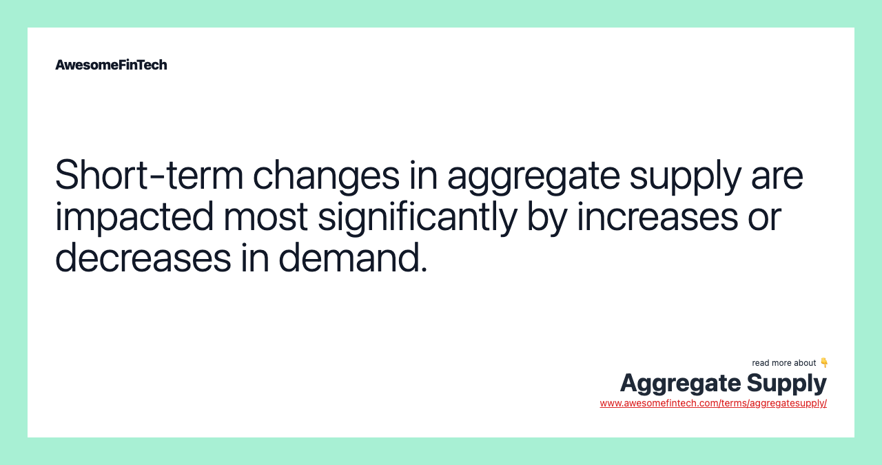 Aggregate supply, also known as total output, is the total supply of goods and services produced within an economy at a given overall price in a given period. It is represented by the aggregate supply curve, which describes the relationship between price levels and the quantity of output that firms are willing to provide. Typically, there is a positive relationship between aggregate supply and the price level.