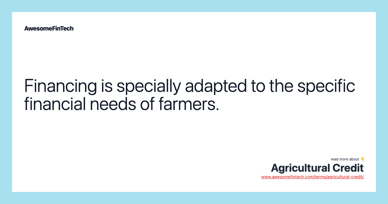 Agricultural credit, which is also commonly referred to as agricultural finance, is an important component of the economy, especially in countries with arable land since agricultural products can be exported. Credit is vital to agricultural businesses because it gives farmers access to capital that might not otherwise be available to them. It helps them secure the seeds, equipment, and land they need to operate a successful farm. Agricultural credit programs not only help farmers and other agricultural producers, but also supports ranchers and rural homeowners with their finances.