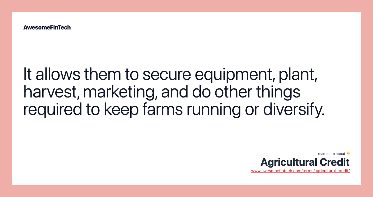 The term agricultural credit refers to one of several credit vehicles used to finance agricultural transactions. These vehicles include loans, notes, bills of exchange, and banker's acceptances. This type of financing is specially adapted to the specific financial needs of farmers and allows them to secure equipment, plant, harvest, marketing, and do other things that are necessary to keep their farms running.