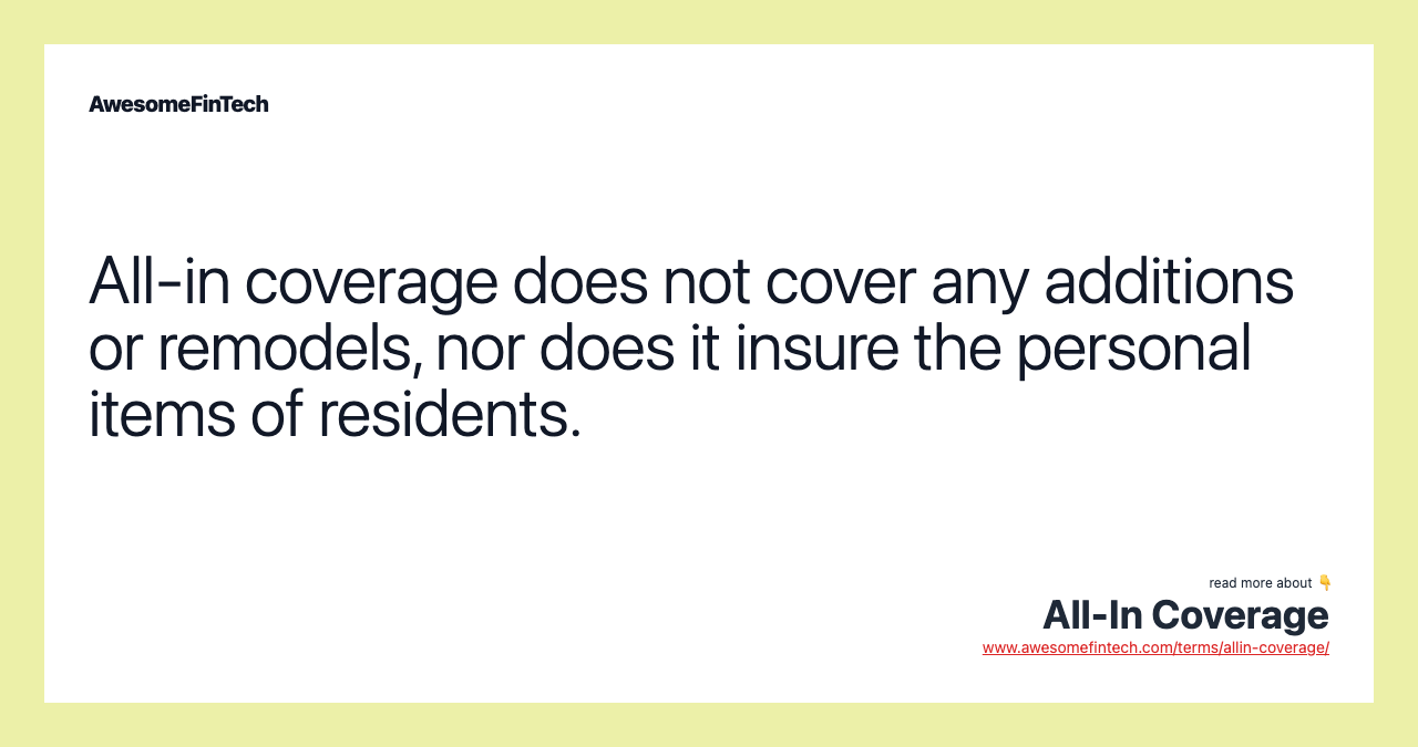 All-in coverage is a type of insurance coverage that applies to communally used features in residential multi-family buildings as well as the structures inside the individual units. All-in coverage, also called all-inclusive coverage, is used for condominiums (or condos), a type of residential property in which some common elements, such as the entryway or light fixtures, are used by all residents of the building.