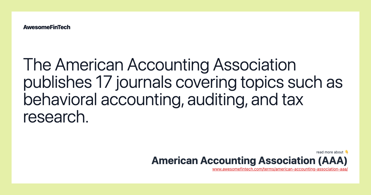 The American Accounting Association (AAA) is an organization that supports worldwide excellence in accounting education, research, and practice. The American Accounting Association is the primary professional association for accounting academics in the United States. The American Accounting Association is the largest community of accountants in academia and produces 17 world-class scholarly journals.