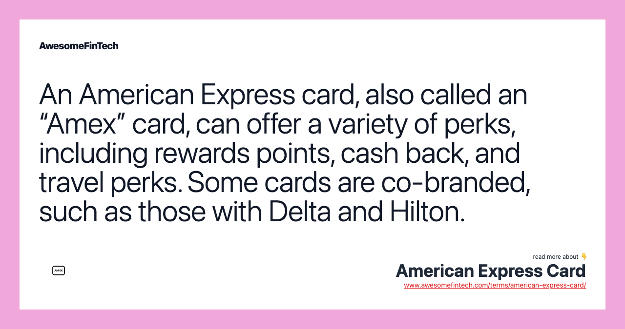 An American Express card, also known as an “Amex” card, is an electronic payment card branded by the publicly traded financial services company American Express (AXP). The company issues and processes prepaid, charge, and credit cards. American Express cards are available to individuals, small businesses, and corporate consumers across the United States and around the world.