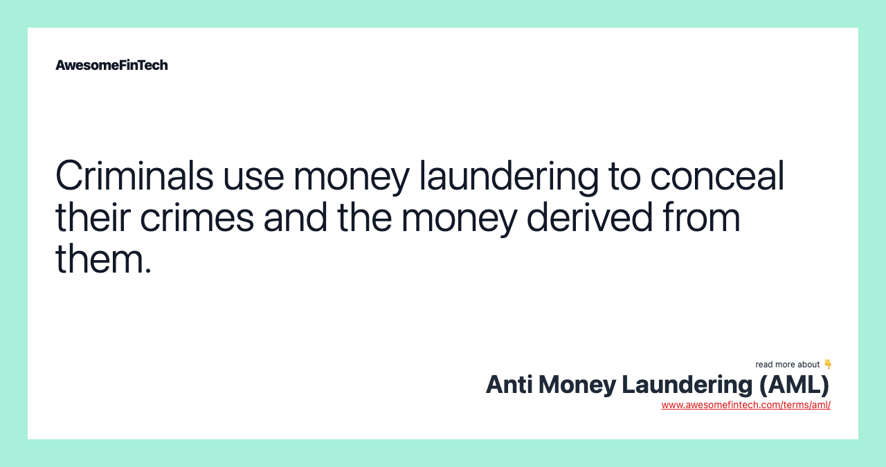 Anti-money laundering (AML) refers to the laws, regulations and procedures intended to prevent criminals from disguising illegally obtained funds as legitimate income.