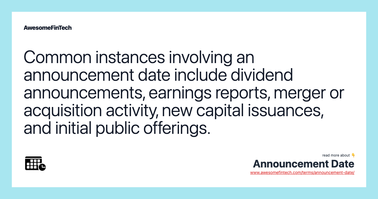 Companies also make announcements related to capital such as new debt issuance, new stock issuance, or buybacks. Initial public offerings (IPOs) are another type of announcement that comes with a notable announcement date.