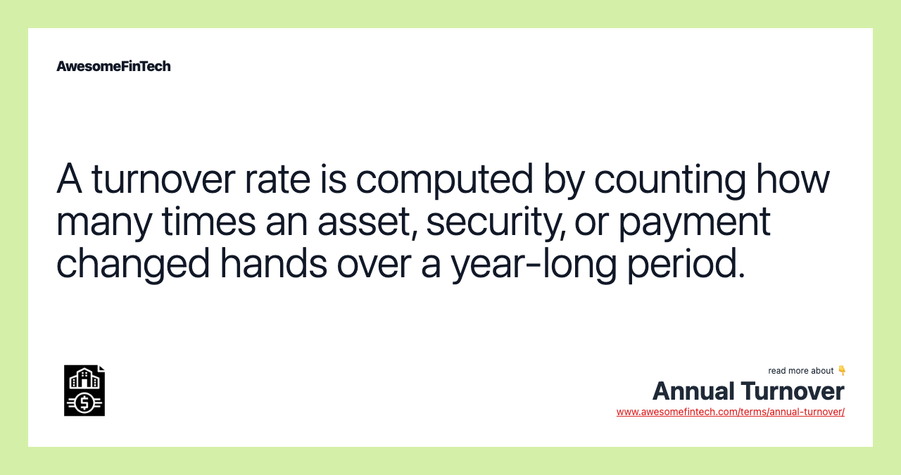 Annual turnover is the percentage rate at which something changes ownership over the course of a year. For a business, this rate could be related to its yearly turnover in inventories, receivables, payables, or assets.