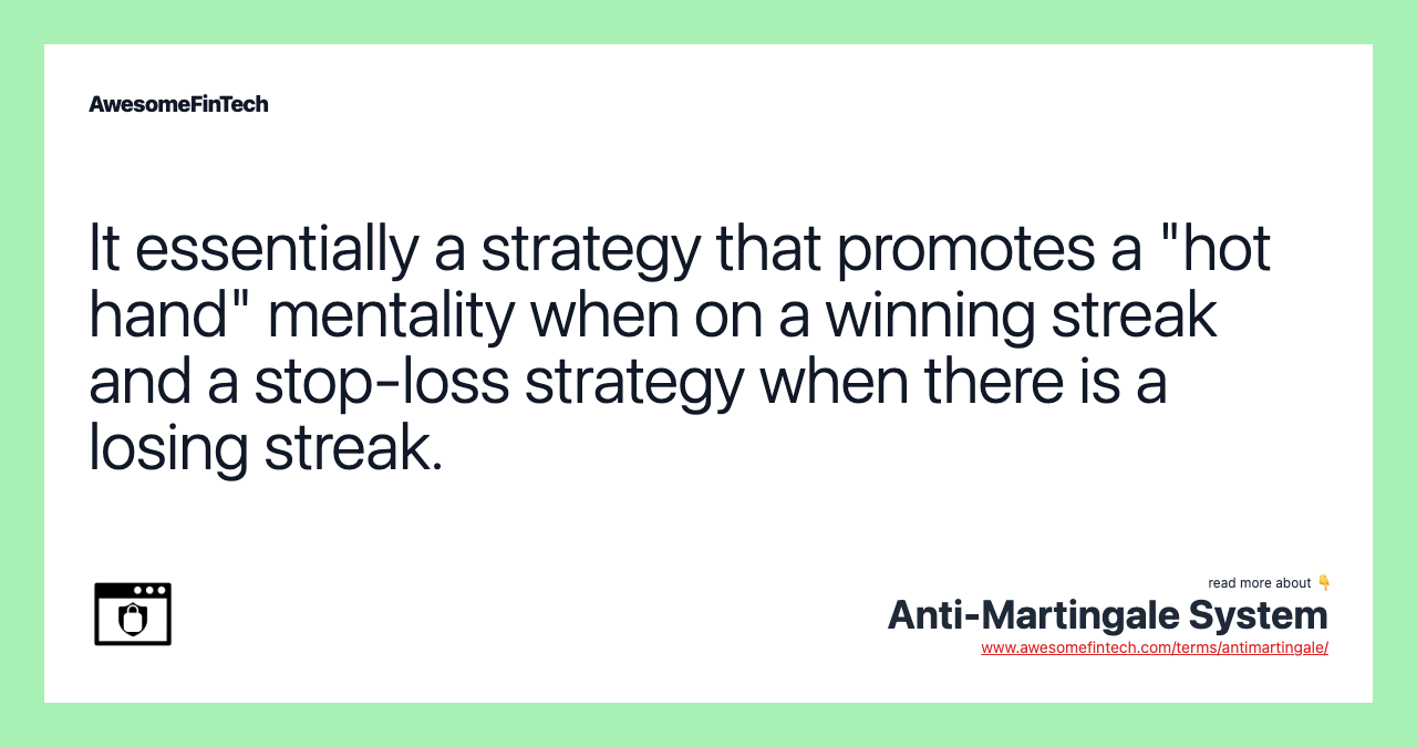 The anti-Martingale, or reverse Martingale, system is a trading methodology that involves halving a bet each time there is a trade loss and doubling it each time there is a gain. The anti-Martingale system accepts greater risks during periods of expansive growth and is considered a better system for traders because it is less risky to increase trade size during a winning streak than during a losing streak. The anti-Martingale, or reverse Martingale, system is a trading methodology that involves halving a bet each time there is a trade loss and doubling it each time there is a gain. Opposite of the traditional Martingale system, the anti-Martingale strategy involves doubling up on winning bets and reducing losing bets by half. This technique is the opposite of the Martingale system, whereby a trader (or gambler) doubles down on a losing bet and halves a winning bet.
