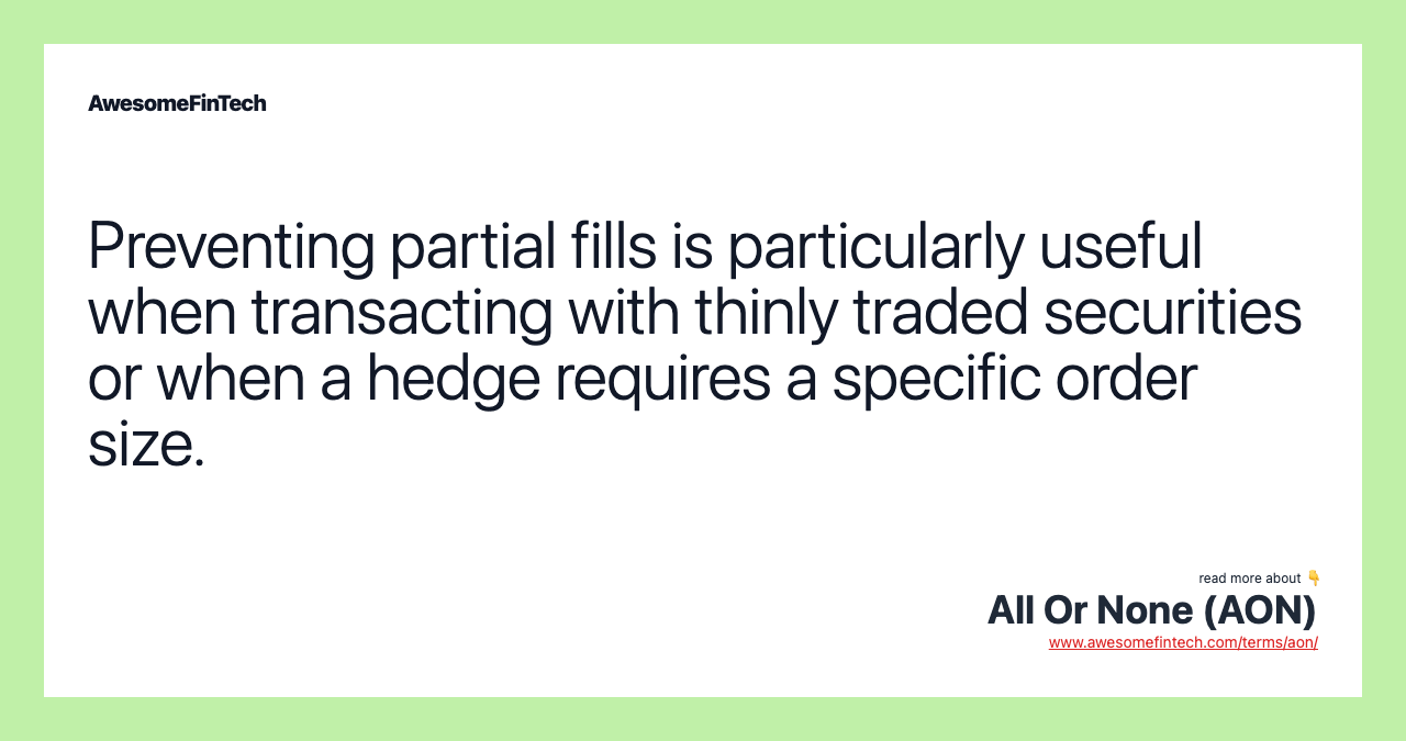 All or none (AON) is a common type of contingent order that specifies the entire size of the order must be filled and that partial fills will not be accepted. AON orders thus involve a directive used on a buy or sell order that instructs the broker to fill the order completely or not at all. If there are too few shares available to fill the order entirely, the order is canceled.