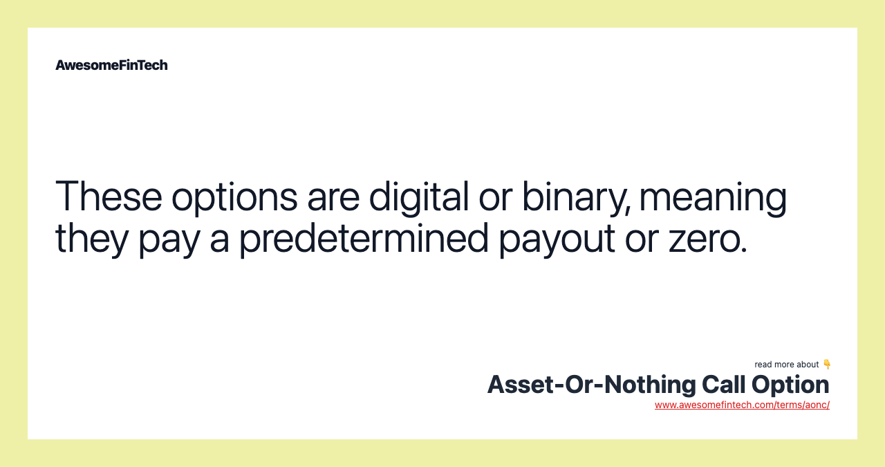 An asset-or-nothing put option provides a fixed payoff if the price of the underlying asset is below the strike price on the option's expiration date. read more