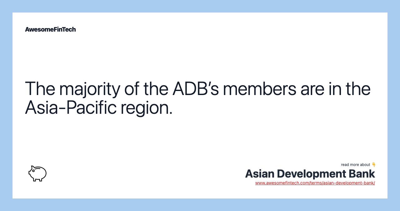 Membership in the ADB is open to members and associate members of the United Nations Economic Commission for Asia and the Far East. It's also open to other regional countries and non-regional developed countries that are members of the U.N. or of any of its specialized agencies.