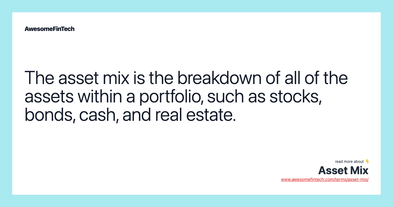 The asset mix is the breakdown of all assets within a fund or portfolio. Broadly, assets can be assigned to one of the core asset classes: stocks, bonds, cash, and real estate. Within that, assets can be mixed even further. An asset mix breakdown helps investors understand the composition of a portfolio and a diversified asset mix reduces the risk of investing.