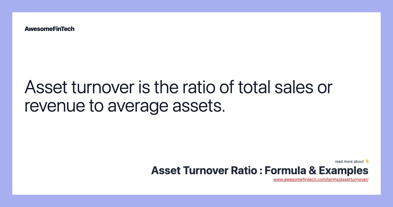 The asset turnover ratio measures the value of a company's sales or revenues relative to the value of its assets. Asset Turnover \= Total Sales Beginning Assets \+ Ending Assets 2 where: Total Sales \= Annual sales total Beginning Assets \= Assets at start of year Ending Assets \= Assets at end of year \\begin{aligned} &\\text{Asset Turnover} = \\frac{ \\text{Total Sales} }{ \\frac { \\text{Beginning Assets}\\ +\\ \\text{Ending Assets} }{ 2 } } \\\\ &\\textbf{where:}\\\\ &\\text{Total Sales} = \\text{Annual sales total} \\\\ &\\text{Beginning Assets} = \\text{Assets at start of year} \\\\ &\\text{Ending Assets} = \\text{Assets at end of year} \\\\ \\end{aligned} Asset Turnover\=2Beginning Assets + Ending AssetsTotal Saleswhere:Total Sales\=Annual sales totalBeginning Assets\=Assets at start of yearEnding Assets\=Assets at end of year The asset turnover ratio uses the value of a company's assets in the denominator of the formula. While the asset turnover ratio considers average _total_ assets in the denominator, the fixed asset turnover ratio looks at only fixed assets. A company's asset turnover ratio can be impacted by large asset sales as well as significant asset purchases in a given year. The first step of DuPont analysis can be illustrated as follows: ROE \= ( Net Income Revenue ) ⎵ Profit Margin × ( Revenue AA ) ⎵ Asset Turnover × ( AA AE ) ⎵ Financial Leverage where: AA \= Average assets AE \= Average equity \\begin{aligned} &\\text{ROE} = \\underbrace{ \\left ( \\frac{ \\text{Net Income} }{ \\text{Revenue} } \\right ) }\_\\text{Profit Margin} \\times \\underbrace{ \\left ( \\frac{ \\text{Revenue} }{ \\text{AA} } \\right ) }\_\\text{Asset Turnover} \\times \\underbrace{ \\left ( \\frac{ \\text{AA} }{ \\text{AE} } \\right ) }\_\\text{Financial Leverage} \\\\ &\\textbf{where:}\\\\ &\\text{AA} = \\text{Average assets} \\\\ &\\text{AE} = \\text{Average equity} \\\\ \\end{aligned} ROE\=Profit Margin(RevenueNet Income)×Asset Turnover(AARevenue)×Financial Leverage(AEAA)where:AA\=Average assetsAE\=Average equity Sometimes, investors and analysts are more interested in measuring how quickly a company turns its fixed assets or current assets into sales.