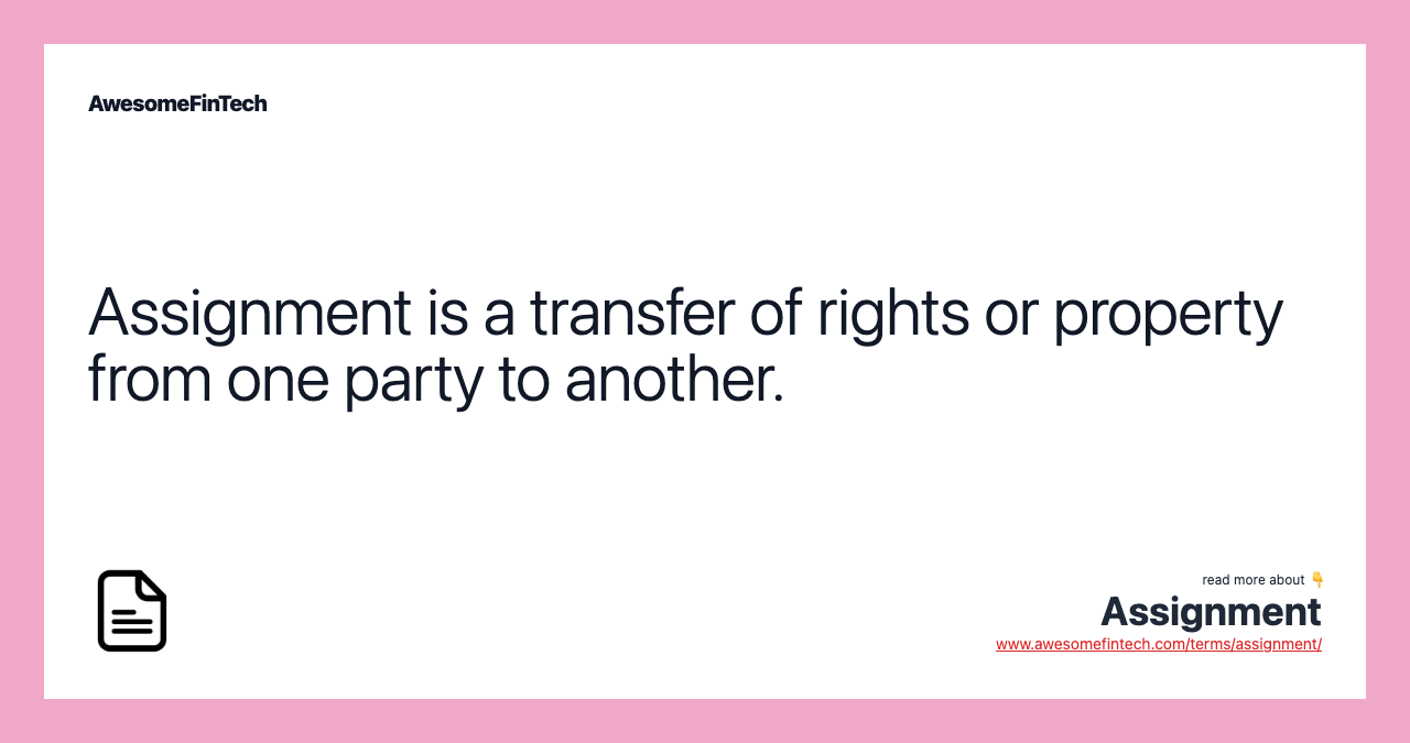 - The transfer of an individual's rights or property to another person or business. This concept exists in a variety of business transactions and is often spelled out contractually.