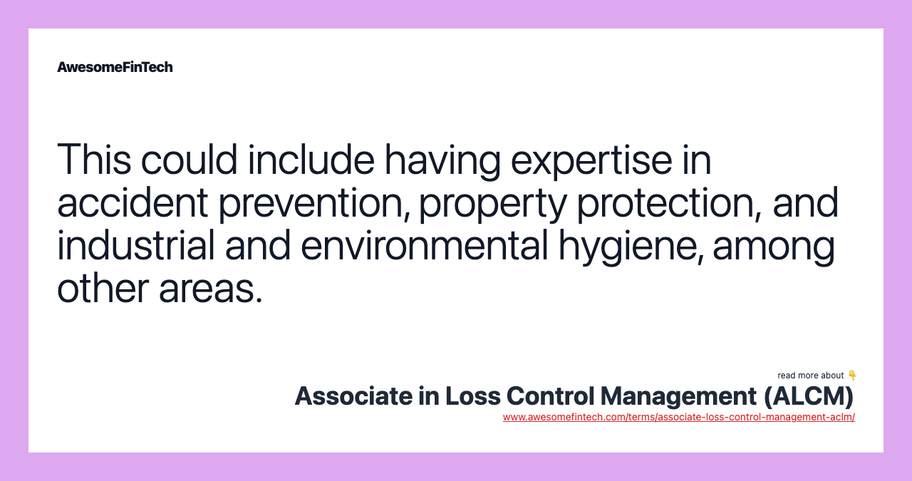 An Associate in Loss Control Management (ALCM) was a professional designation earned after the successful completion of a self-study program and passing five national examinations given by the Insurance Institute of America (IIA). An Associate in Loss Control Management designation was designed for individuals whose workplace responsibilities revolved around loss controls. An associate with this designation would be expected to have expertise in accident prevention, property protection, and industrial and environmental hygiene, among other related fields.