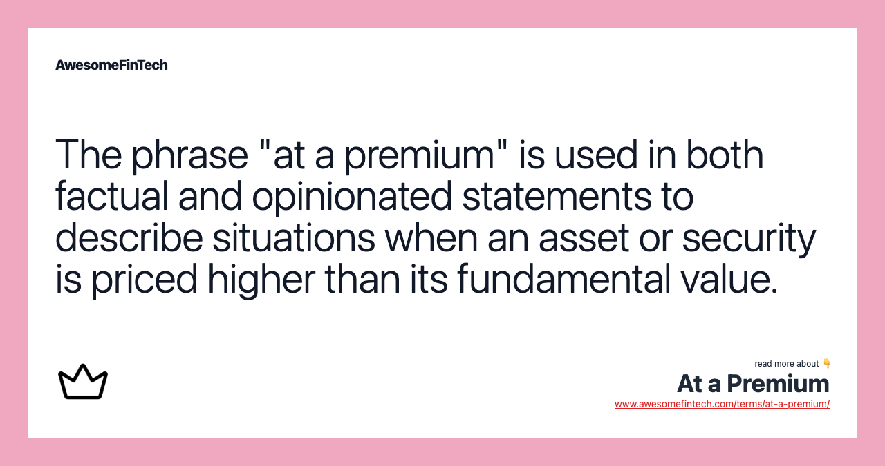 There are a variety of situations where an asset trades at a premium to its fundamental value for some period, but the phrase can also reveal the speaker's own personal assessment of the asset's intrinsic value_ — _which may be the result of a cognitive or emotional bias.