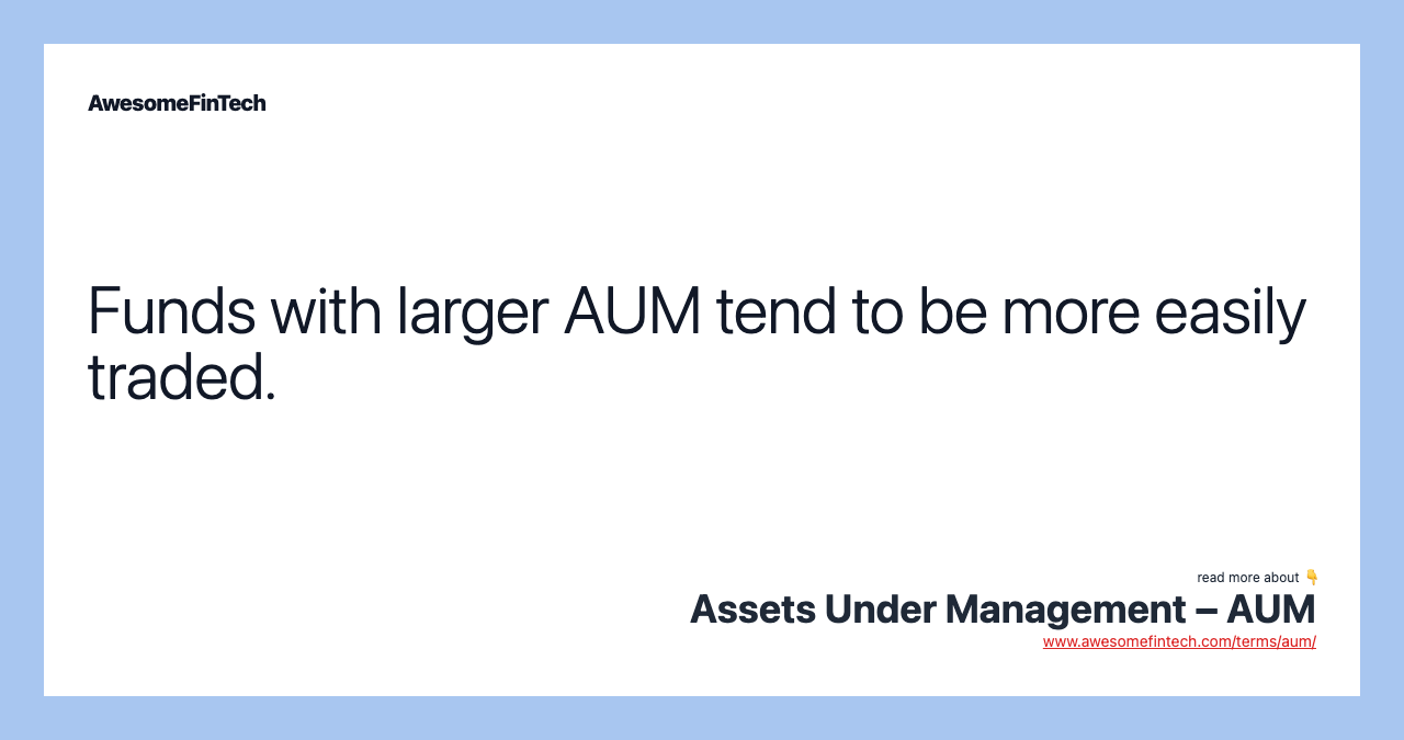 When evaluating a specific fund, investors often look at its AUM since it functions as an indication of the size of the fund. Typically, investment products with high AUMs have higher market trading volumes making them more liquid, meaning investors can buy and sell the fund with ease.
