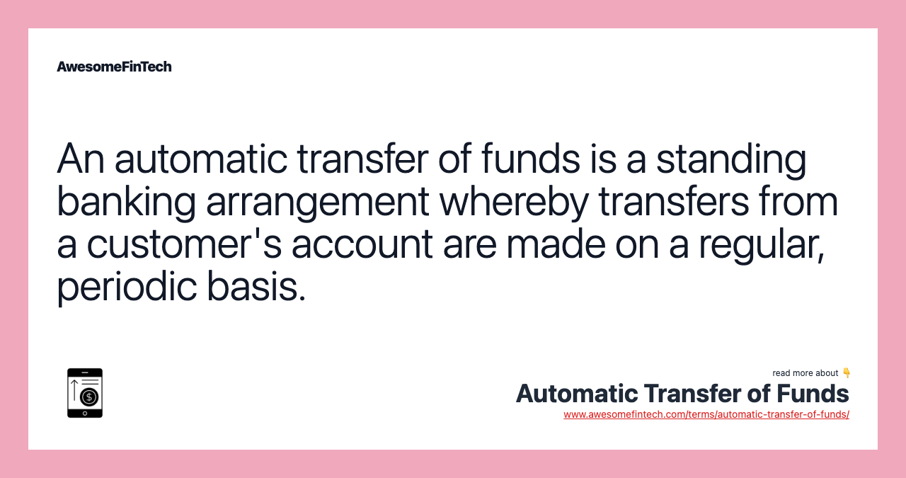 An automatic transfer of funds is a standing banking arrangement whereby transfers between a customer's two (or more) accounts are made on a regular, periodic basis under specified conditions. Automatic transfers are executed without further instruction or action by the customer; a common way that automatic transfers are executed is through "sweep" instructions, whereby all excess funds in one account are swept into another account. The automatic transfer of funds is one core offering of both commercial and online banks.