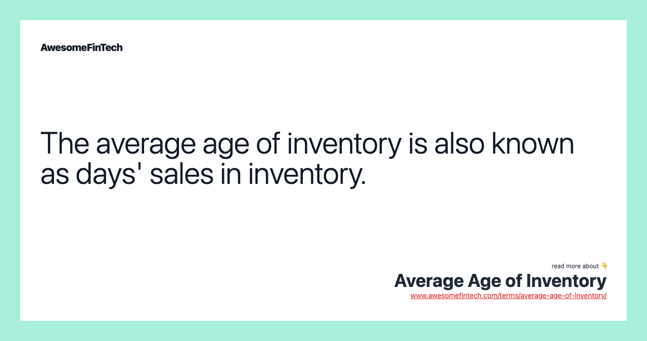 The average age of inventory is the average number of days it takes for a firm to sell off inventory. The average age of inventory is also referred to as days' sales in inventory (DSI). The formula to calculate the average age of inventory is: Average Age of Inventory \= C G × 3 6 5 where: C \= The average cost of inventory at its present level G \= The cost of goods sold (COGS) \\begin{aligned} &\\text{Average Age of Inventory}= \\frac{ C }{ G } \\times 365 \\\\ &\\textbf{where:} \\\\ &C = \\text{The average cost of inventory at its present level} \\\\ &G = \\text{The cost of goods sold (COGS)} \\\\ \\end{aligned} Average Age of Inventory\=GC×365where:C\=The average cost of inventory at its present levelG\=The cost of goods sold (COGS) The average age of inventory tells how many days on average it takes a company to sell its inventory. Conversely, Company B also owns inventory valued at $100,000, but the cost of inventory sold is $1 million, which reduces the average age of inventory to 36.5 days. A high average age of inventory can indicate that a firm is not properly managing its inventory or that it has an inventory that is difficult to sell. The average age of Company A's inventory is calculated by dividing the average cost of inventory by the COGS and then multiplying the product by 365 days.