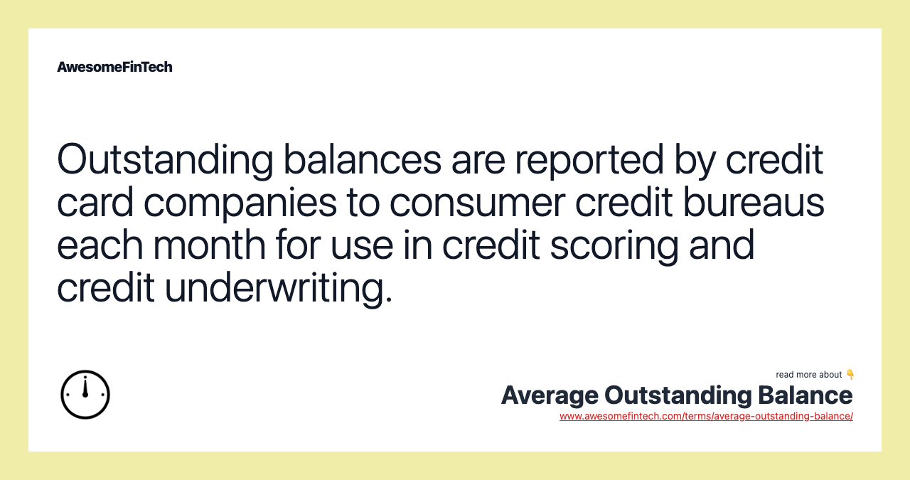 An average outstanding balance is the unpaid, interest-bearing balance of a loan or loan portfolio averaged over a period of time, usually one month. The average outstanding balance can refer to any term, installment, revolving, or credit card debt on which interest is charged. It may also be an average measure of a borrower’s total outstanding balances over a period of time.