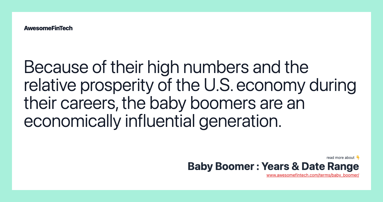 Table of Contents What Is a Baby Boomer? As the longest-living generation in history, boomers are at the forefront of what’s been called a longevity economy, whether they are generating income in the workforce or, in their turn, consuming the taxes of younger generations in the form of their Social Security checks. By 2034, it is projected that older adults will outnumber those under age 18 for the first time in U.S. history. In a 2016 study by AARP, Baby boomers spend $7 trillion per year on goods and services. The problem is that the baby boomer generation is much larger than previous generations; Generation X, which follows it, is much smaller; and even the larger-than-the-boomers millennial generation isn't large enough to offset the increased longevity of boomers. And even though they are aging (the very youngest boomers are in their late 50s as of 2021) they continue to hold corporate and economic power; in the U.S., 54% of personal net worth belongs to boomers. As the largest generational group in U.S. history (until the millennial generation slightly surpassed them), baby boomers have had — and continue to have — a significant impact on the economy.