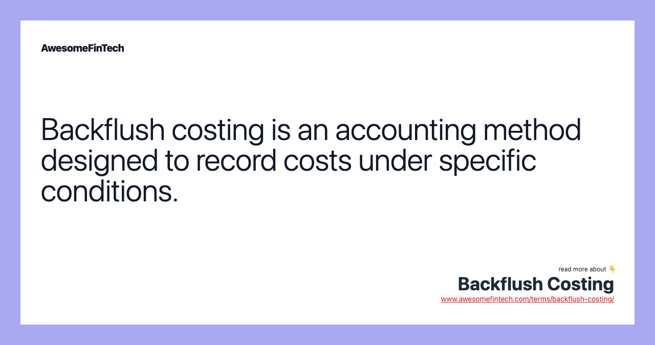 Backflush costing is a product costing system generally used in a just-in-time (JIT) inventory system. In short, it is an accounting method that records the costs associated with producing a good or service only after they are produced, completed, or sold. Backflush costing is also commonly referred to as backflush accounting.