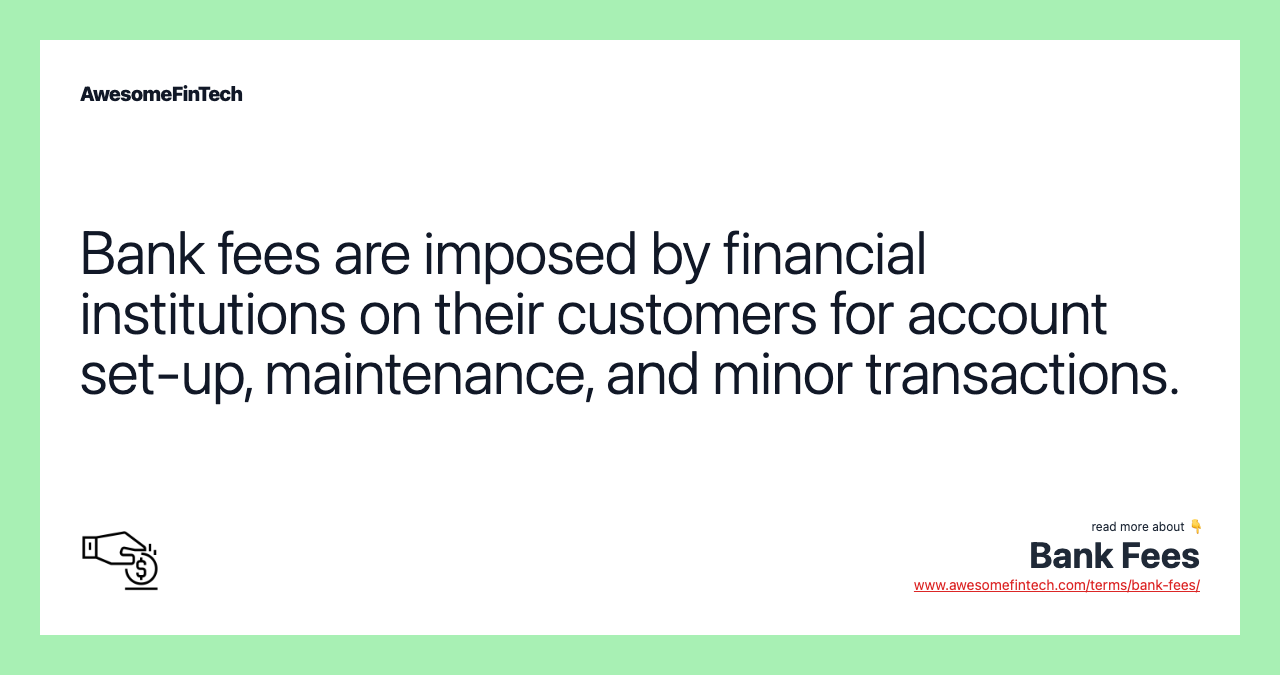The term bank fees refers to any charges imposed by financial institutions on their personal and business customers for account set-up, maintenance, and minor transactional services. These fees may be charged on a one-time or ongoing basis. Examples of bank fees range from account maintenance charges, withdrawal and transfer fees, automated teller machine (ATM) fees, non-sufficient fund (NSF) fees, late payment charges, and others.