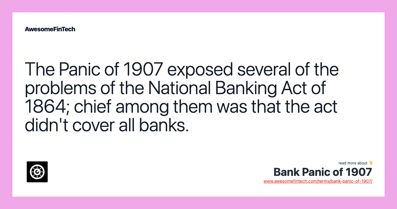 The Panic of 1907 exposed several of the problems of the National Banking Act of 1864. One of the biggest issues with the act was that it didn't cover all banks.