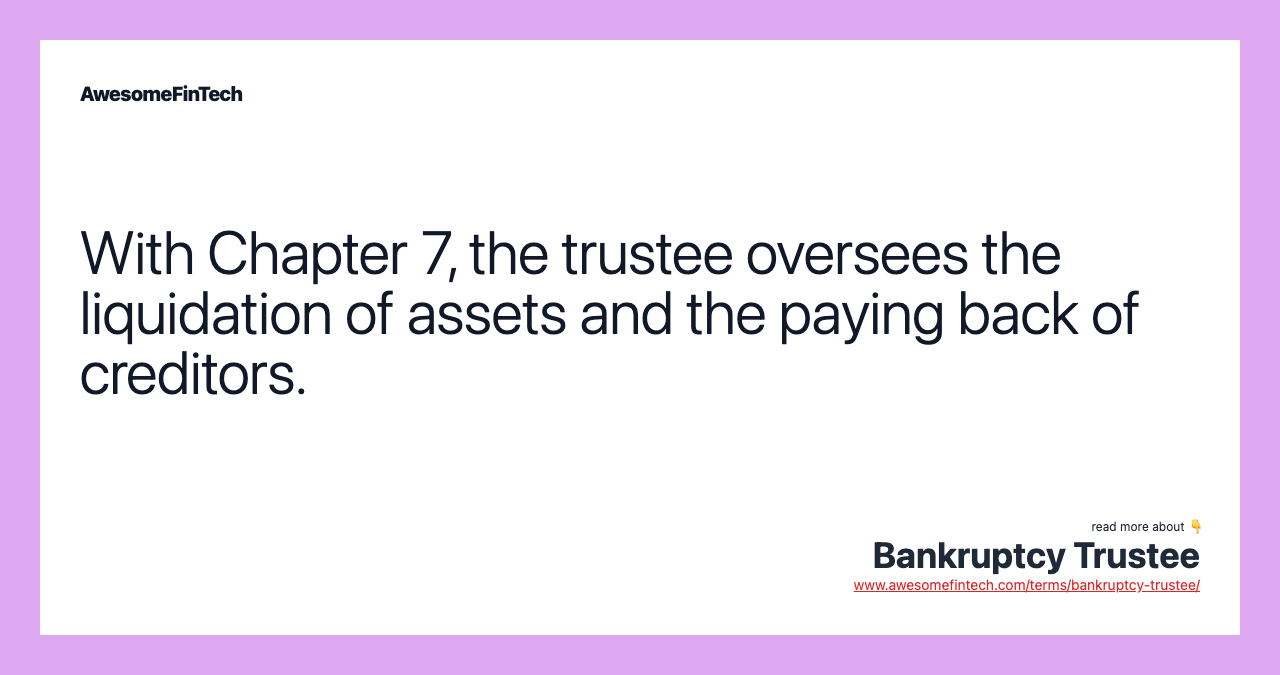 A trustee's responsibilities differ based on the type of bankruptcy proceeding they are attending. In a Chapter 7 bankruptcy proceeding, the action is essentially a liquidation. The trustee will manage the sale of the assets and then oversee the distribution of the proceeds to creditors.