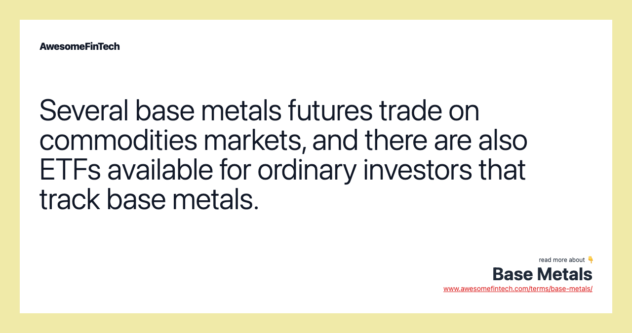 Base metals are common metals that tarnish, oxidize, or corrode relatively quickly when exposed to air or moisture. Several base metals futures trade on commodities markets, and there are also ETFs available for ordinary investors that track base metals. While iron corrodes and rusts when exposed to water and air, base metals exclude iron by referring only to non-ferrous industrial metals. Unlike precious metals, base metals tend to tarnish, oxidize, or corrode over time or when exposed to the elements. The term base metals likely arose because these materials are inexpensive and more commonly found than precious metals, such as gold, silver, and platinum.