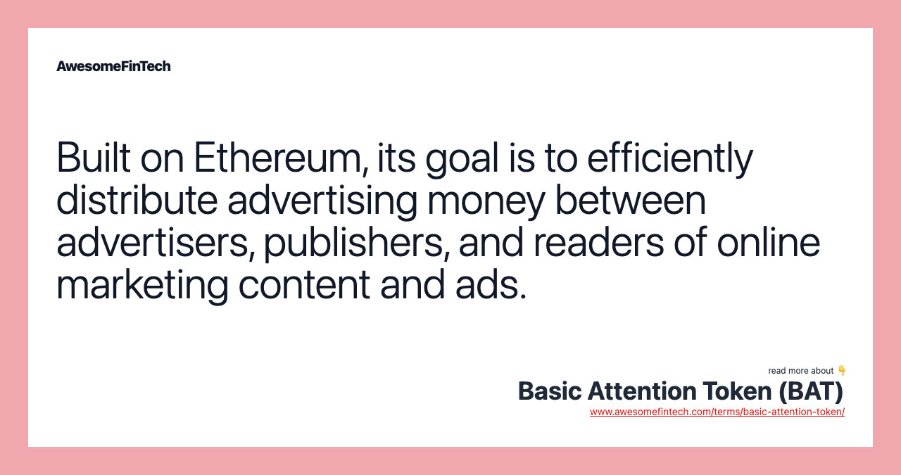 The Basic Attention Token (BAT) was created by the co-founder of Mozilla and Firefox, Brendan Eich, in an effort to improve the security, fairness, and efficiency of digital advertising through the use of blockchain technology. It is the native token of the Brave web browser and is built on top of Ethereum. BAT's white paper is dated Jan. 7, 2018. As of 2021, the project is still being developed, although a beta version of the Brave browser is available for download. As of Sept. 23, 2021, there are 36.2 million monthly active users and 12.5 million daily users of the Brave browser.