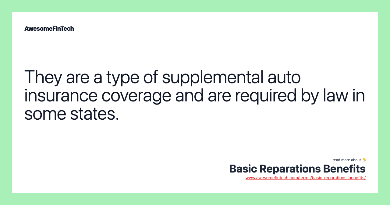 In the insurance industry, basic reparations benefits are a type of automobile insurance that provides assistance with medical expenses, lost income, and essential services following a car accident. Because basic reparations coverage is considered optional, the injured party will have to successfully sue the negligent party to pay for medical expenses unless the driver has purchased basic reparations benefits coverage. In the insurance industry, basic reparations benefits are a type of automobile insurance that provides assistance with medical expenses, lost income, and essential services following a car accident. If the injured driver does have basic reparations benefits, then that policy would pay for their medical expenses, a portion of their lost income, and other essential services, regardless of which party was at fault, making it unnecessary to sue the negligent driver. Basic benefits reparations are generally more expensive than other types of auto insurance, because they provide coverage for lost income and essential services in addition to basic medical costs.