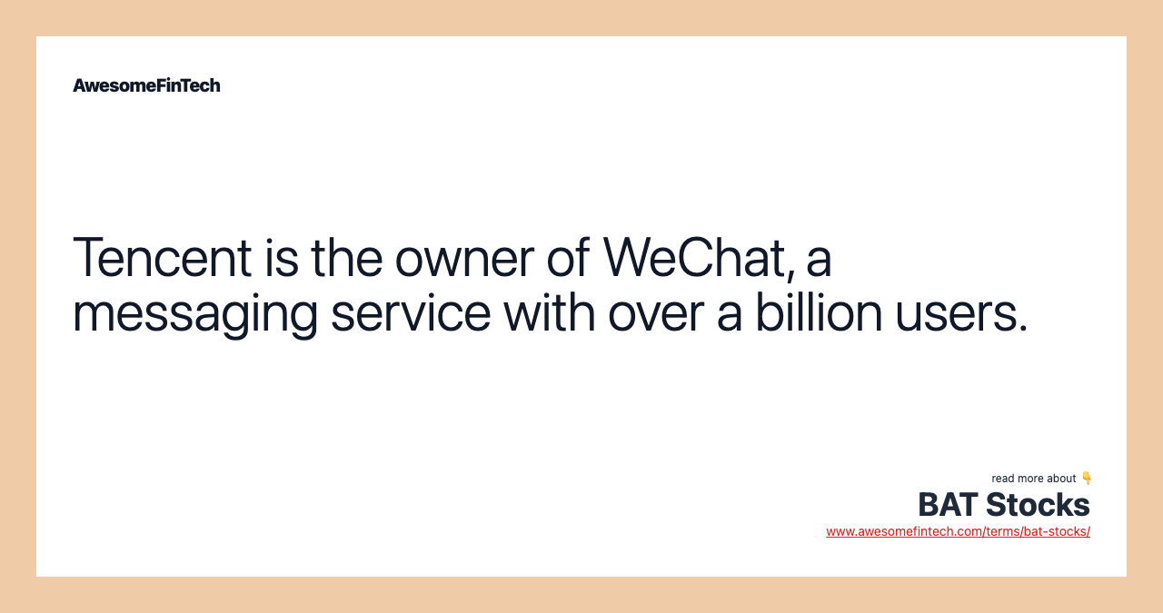 Table of Contents What Are BAT Stocks? Understanding BAT Stocks Baidu (BIDU) Alibaba (BABA) BAT is an acronym referring to three of the largest tech companies in China: Baidu Inc. (BIDU), Alibaba Group Holding Ltd. (BABA), and Tencent Holdings Ltd. (0700.Hong Kong, TCEHY). Tencent, founded in 1998 in Shenzen, China, is a multi-faceted tech company whose platform offers numerous products and services including social media, music, web portals, e-commerce, mobile games, internet services, payment systems, smartphones, and multiplayer online games. BAT stocks is an acronym used to refer to the three largest tech stocks in China: Baidu Inc., Alibaba Holding Group Ltd., and Tencent Holdings Ltd. Alibaba is an e-commerce firm that operates two main online portals: Taobao, for consumer-to-consumer commerce, and a business-to-consumer counterpart, Tmall.